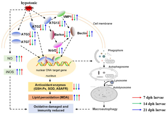 Schematic diagram depicting the effects and possible mechanisms of hypotonic stress on antioxidant, immune capacity and autophagy related genes expression. Notes: The red arrow is representative of 7 dph larvae, green arrow is representative of 14 dph larvae, and blue arrow is representative of 21 dph larvae under hypotonic stress compare with normal salinity group; The upward arrow is representative of gene expression activation and the downward arrow is inhibition of gene expression.