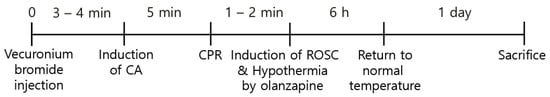 The rodent ventilator (Harvard Apparatus, Holliston, MA, USA) and 2–3% isoflu-rane were used for anesthesia and ventilation during the CA and CPR procedures. A pulse oximeter connected to the left leg was used for monitoring the peripheral oxygen saturation (SpO2). Furthermore, electrocardiography (ECG) readings and the mean arterial pressure (MAP) were constantly monitored through the limbs and left femoral artery, respectively. After 5 min, 2 mg/kg vecuronium bromide was intravenously injected for the induction of CA [] followed by ceasing of the ventilation. The induction of CA was considered when MAP fell below 20 mmHg [], resulting in pulseless electrical activity (PEA), which took 3–4 min after the injection of the drug. After 5 min following the induction of CA, a 0.005 mg/kg bolus of epinephrine and 1 mg/kg sodium bicarbonate were intravenously administered. Subsequently, CPR was performed by mechanical chest compression on the chest of the rats at a depth of one-third of the anteroposterior region, at a rate of 300/min, and with 100% oxygen supply using an animal CPR machine (Jeung Do Bio & Plant Co., Ltd., Seoul, South Korea) until MAP returned to 60 mmHg []. During the CPR procedure, ECG and body temperature were constantly monitored (Figure 1).