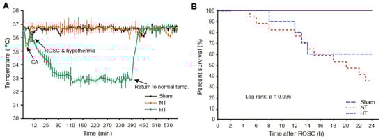 Male Sprague–Dawley rats weighing 280–310 g obtained from the Experimental Animal Center of Jeonbuk National University (Jeonju, South Korea) were individually housed under controlled environment with the temperature (23 ± 2 °C) and humidity (60 ± 10%) control with a 12-h light/dark cycle. Food and water were available ad libitum. The rats were randomly assigned to three groups: sham (n = 6), CA + normothermia (NT, n = 27), and CA + hypothermia (HT, n = 17) groups. All the procedures were approved by the Institutional Animal Care and Use Committee of Jeonbuk National University (JBNU 2020-084).