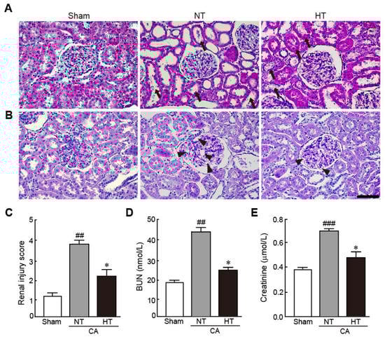 Olanzapine-induced TH attenuates renal injury in CA-induced rats. Representative photographs of H&E (A) and PAS staining (B) using renal tissues from rats after CA and ROSC with or without olanzapine-induced TH (n = 5 per group). Arrows and arrowheads indicate brush borders in renal tubules and glomerular capillaries. (C) The renal injury scores of rats after CA and ROSC with or without olanzapine-induced TH. Serum BUN (D) and creatine (E) levels were measured in rat tissues after CA and ROSC with or without olanzapine-induced TH (n = 5 per group). Significance is represented as ## p < 0.01 or ### p < 0.001 vs. the sham group; * p < 0.05 vs. the CA + NT group. CA, cardiac arrest; TH, therapeutic hypothermia; NT, normothermia; HT, hypothermia. Scale bar, 50 µm.