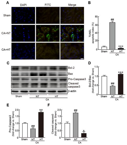 Olanzapine-induced TH inhibits CA-induced apoptotic cell death in renal tissues. (A) Representative photographs of TUNEL staining of rat tissues after CA and ROSC with or without olanzapine-induced TH. The apoptotic index (B) was determined by calculating the percentages of TUNEL-positive and total cells. (C–F) Western blot analysis for the expression of Bcl-2, Bax, pro-caspase 3, cleaved caspase 3, and β-actin proteins in renal tissues after CA and ROSC with or without olanzapine-induced TH (n = 3 per group). Significance is represented as ## p < 0.01 vs. the sham group; * p < 0.05, ** p < 0.01, and *** p < 0.001 vs. the CA + NT group. CA, cardiac arrest; TH, therapeutic hypothermia; NT, normothermia; HT, hypothermia. Scale bar, 100 µm.