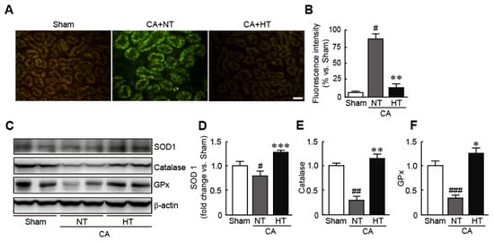To determine whether hypothermia treatment attenuates oxidative stress in CA-induced rats, ROS production in the renal tissues was assessed by staining with DCFH-DA, an ROS detection dye. The results revealed that the fluorescence intensity of DCFDF-DA, as indicated by green fluorescence, was higher in CA + normothermia group than in the sham group, indicating that CA causes the rapid generation of ROS (81.2% increase in CA + normothermia group vs. the sham group) (Figure 5A,B). In contrast, the fluorescence intensity of DCFH-DA was not detectable in the CA + hypothermia group (6.4% increase in the CA + hypothermia group vs. the sham group) (Figure 5A,B). Moreover, olanzapine-induced TH significantly increased the expression levels of several antioxidants, including SOD1, catalase, and GPx—in contrast to the decreases in the expression levels of these proteins in the CA + normothermia group (0.8, 0.3 and 0.4-fold decreases in SOD1, catalase, and GPx levels, respectively, in the CA + normothermia group and 1.4, 1.2 and 1.3-fold increases, respectively, in the CA + hypothermia group vs. the sham group) (Figure 5C,D). These findings indicate that olanzapine-induced TH can effectively attenuate oxidative stress in CA-induced renal tissues. (Figure 5C,D).