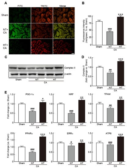 Olanzapine-induced TH preserves mitochondrial integrity affected by CA in renal tissues. Representative photographs (A) and intensities of red and green fluorescence (B), as observed by JC-1 staining of rat tissues after CA and ROSC with or without olanzapine-induced TH. (C,D) Western blot analysis for measuring the expression levels of mitochondrial complex II and β-actin proteins. (E) qRT-PCR analysis for measuring the mRNA expression levels of mitochondrial biogenesis-related genes (n = 3 per group). Significance is represented as # p < 0.05, ## p < 0.01 and ### p < 0.001 vs. the sham group; * p < 0.05, ** p < 0.01, and *** p < 0.001 vs. the CA + NT group. CA, cardiac arrest; TH, therapeutic hypothermia; NT, normothermia; HT, hypothermia. Scale bar, 100 µm.