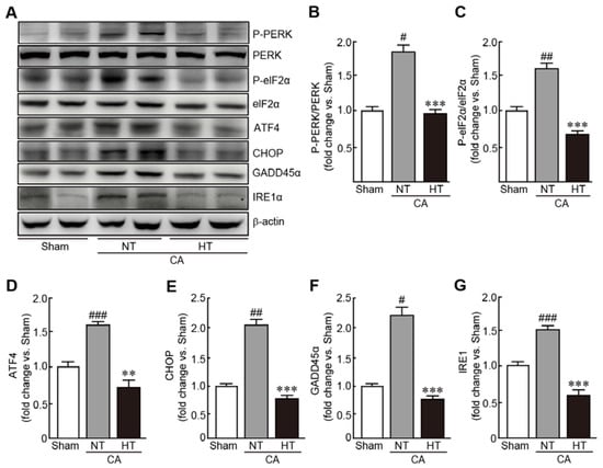 To evaluate the preventive effects of hypothermia against CA-induced ER stress, expression of several ER stress-related proteins were determined, including PERK, eIF2α, ATF4, CHOP, GADD45α and IRE1α. In the CA + normothermia group, the expression of p-PERK and p-eIF2α were elevated, indicating that these proteins were activated because of CA and ROSC (1.8- and 1.6-fold increases in p-PERK and p-eIF2α, respectively, in the CA-induced group vs. the sham group) (Figure 7A–C). The expression levels of ATF4, CHOP, GADD45α and IRE1α were also elevated in the CA-induced group (1.6, 2.1, 2.2, and 1.2-fold increases in ATF4, CHOP, GADD45α and IRE1α, respectively, in the CA + normothermia group vs. the sham group) (Figure 7A,D–G). Notably, olanzapine-induced TH significantly inhibited the increase in the expression levels of these proteins, keeping their expression levels similar to those in the sham group. These results indicate that olanzapine-induced TH can effectively attenuate ER stress caused by CA and ROSC.