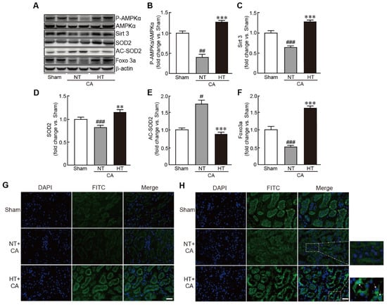 Olanzapine-induced TH activates the Sirt3-related signaling pathway in CA-induced renal tissues. (A–F) Western blot analysis for measuring the expression levels of proteins involved in the Sirt3 signaling pathway in rat tissues after CA and ROSC with or without olanzapine-induced TH (n = 3 per group). Representative photographs of Sirt3 (G) and FOXO3a (H) protein staining results in rat tissues after CA and ROSC with or without olanzapine-induced TH. Arrows indicate the cells that contain Sirt3 in the nucleus. Significance is represented as ## p < 0.01 and ### p < 0.001 vs. the sham group; ** p < 0.01 and *** p < 0.001 vs. the CA + NT group. CA, cardiac arrest; TH, therapeutic hypothermia; NT, normothermia; HT, hypothermia. Scale bar, 100 µm.