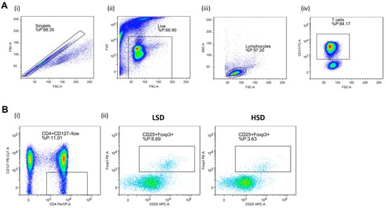 Gating strategy for the assessment of peripheral blood regulatory T cells (Treg) by flow cytometry. Panel (A) shows representative dot plots illustrating gating strategy, including exclusion of doublets using forward scatter area (FSC-A) versus forward scatter width (FSC-W) analysis (A-i), gating on live cells negative for aminereactive fixable viability dye (A-ii), lymphocytes (A-iii), and CD3+ T cells (A-iv). Next, total CD25 and Foxp3, expressing T cells among CD4+CD127 low population, were analyzed (Panel (B)). (B-i) shows representative gating strategy, (B-ii) representative samples from LS and HS protocol. FlowLogic software was used for data analysis and illustration.