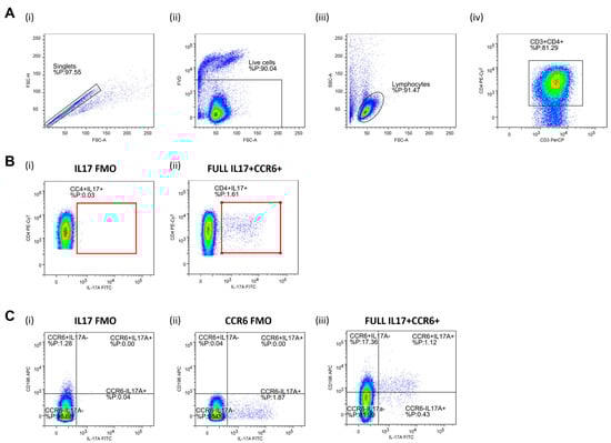 Gating strategy for the assessment of peripheral blood Th17 population by flow cytometry. Panel (A) shows representative dot plots illustrating gating strategy, including exclusion of doublets using forward scatter area (FSC-A) versus forward scatter width (FSC-W) analysis (A-i), gating on live cells negative for amine-reactive fixable viability dye (A-ii), lymphocytes (A-iii), CD3+ T cells (A-iv), and CD3+CD4+ T helper cells (A-iv). T helper cells were subsequently analyzed for IL-17A and CD196/CCR6 expression. First, total IL-17-secreting T helper cells were analyzed (Panel (B)) where the gate on IL-17+ T cells were defined using florescence minus one (FMO) control for IL17 antibody (B-i). A representative sample demonstrating relative frequencies of peripheral CD4+IL-17+ T helper cells in healthy young individuals are shown at (B-ii). The population of IL-17-secreting T helper cells was further analyzed for CD196/CCR6 expression (panel (C), C-iii), hence two subpopulations were identified—CD4+CD196+IL17+ corresponding to Th17 cells and CD4+CD196-IL17+ non-Th17 cells accounting for other T helper subpopulations with the capacity to secrete IL-17. FMO controls for antibodies with specificities for IL17 and CCR6 were utilized for the setup of quadrant gates (C-i, C-ii). FlowLogic software was used for data analysis and illustration.