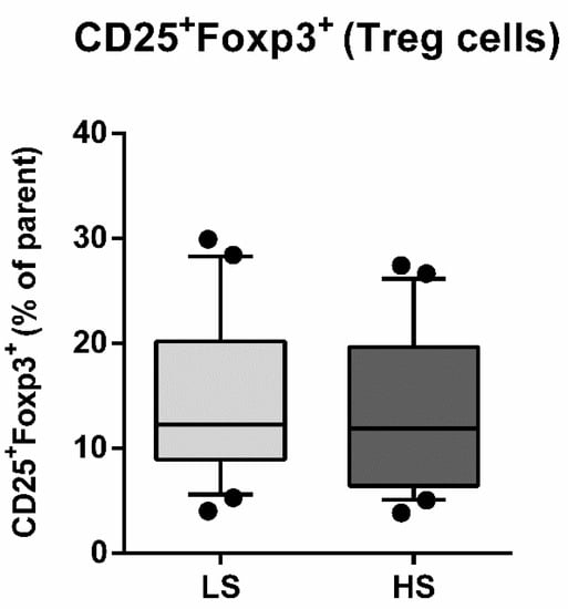Beside cardiovascular diseases, including hypertension, have been recently characterized with an imbalance between Th17 and Treg cells [], and excessive salt intake/exposure has been shown as a novel and potent driver of Th17 cell differentiation and autoimmunity [,,]. A particularly important cytokine in the development of cardiovascular diseases is IL-17A, which is mainly produced by Th17 cells. It has been demonstrated that IL-23 reinforces the Th17 phenotype by increasing the expression of IL-23 receptor (IL-23R), resulting in pathogenicity of Th17 cells, but it also suppresses development of Treg cells [,,]. On the other hand, Treg cells (FoxP3+), with TGF-β as a critical regulator of its development and function and its key product, anti-inflammatory cytokine IL-10, are involved in immune tolerance and homeostasis [,]. In the present study, the short-term HS diet resulted in increased level of IL-17A, indicating the activation of Th17 cells, as well as in moderate positive correlation between IL-23 serum level and frequencies of Th17 cells, supporting IL-23/Th17 cells axis in Th17 cells activation. Interestingly, TGF-β was also significantly increased with the HS diet in the present study, suggesting that it may be a key player in simultaneous activation of anti-inflammatory hand of Th17/Treg activation in response to HS diet.