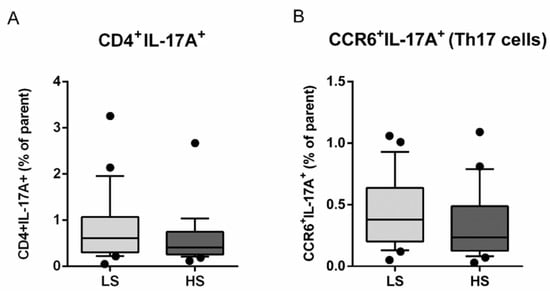 The seven-day HS diet resulted in unchanged frequency of CD25/Foxp3-expressing peripheral blood lymphocytes (Treg), within the CD4+CD127+ subpopulation (CD25+Foxp3+% of parent LS 14.54 ± 7.76 vs. HS 13.49 ± 7.53, p = 0.288) (Figure 3). The frequency of total IL-17-secreting peripheral T helper cells was not significantly changed, following the HS diet (CD4+IL-17A+% of parent LS 0.80 ± 0.73 vs. HS 0.59 ± 0.53, p = 0.173) (Figure 4A). These cells were further immunephenotyped and, based on their CCR6 expression, subdivided to Th17 (CCR6+IL-17+) and non-Th17 (CCR6-IL-17+) T helper cells, with the latter corresponding mostly to IL-17-secreting Th1 and Th2 T helper cells. The HS diet did not induce significant change in the frequency of Th17 cells, compared to LS conditions (CCR6+IL-17A+% of parent LS 0.43 ± 0.28 vs. HS. 0.33 ± 0.28, p = 0.256) (Figure 4B). Th17/Treg ratio also remained unaltered, following HS diet, compared to LS conditions in healthy salt-resistant individuals (Th17/Treg LS 0.039 ± 0.036 vs. HS 0.031 ± 0.030, p = 0.347).