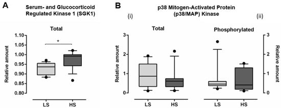 The effect of a 7-day high-salt diet on relative amount of total serum- and glucocorticoid regulated kinase 1 (SGK1) (A) and total (B-i) and phosphorylated (B-ii) p38 mitogen-activated protein (MAP) kinase (B) in young healthy individuals. N = 30 (15 women and 15 men). LS—low salt; HS—high-salt; N—number of subjects). Data are presented as box-and-whisker plots 10 to 90 percentiles. Paired t-test, * p < 0.05, LS diet vs. HS diet.