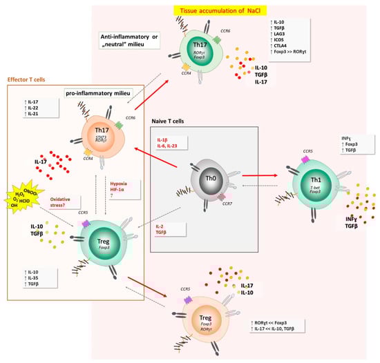 Dichotomous, context-dependent fate of T helper cells, when exposed to high-salt conditions. Naïve cell, exposed to hyperosmotic and pro-inflammatory environment, primed under Th17 polarizing cytokines, acquired enhanced Th17 function. This effect was also observed among other T helper cell compartments (i.e., Th1 subpopulation). Interestingly, if the Th17 cells are void of pro-inflammatory milieu during activation in high NaCl environment (and re-activation at the sites of ongoing immune responses against certain pathogens or (auto)antigens), they acquire anti-inflammatory phenotype and function, characterized by the up-regulation of IL-10, TGFβ, Foxp3, CTLA-4, ICOS, and LAG3. Increased oxidative stress may alter immune regulatory mechanisms, potentially via effects on Treg cells.