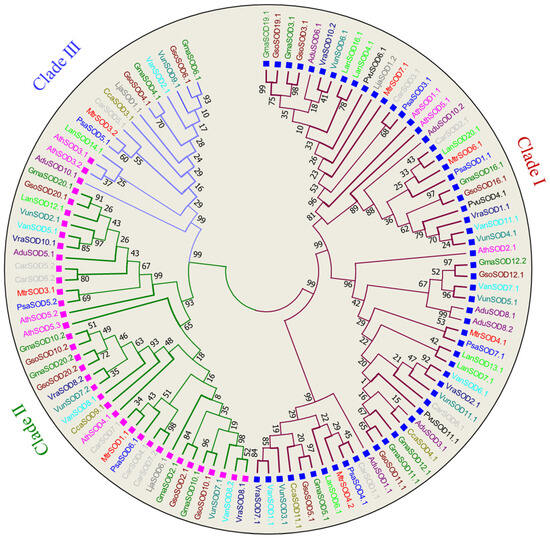 Thirteen legume species along with model plant A. thaliana were selected to study the evolutionary history of SOD and GPX genes. Phylogenetic analysis of 109 SOD proteins was conducted to know the phylogenetic relationship among all the SOD genes of selected species. Based on tree topology, the SOD proteins of all species were categorized into three major groups viz., Cu/Zn-SODs (clade I), Fe-SODs (clade II) and Mn-SODs (clade III) (Figure 1). Clade I consisted of 59 Cu/Zn-SODs proteins, predicted to be localized in the cytoplasm, while Clade II clustered together 35 Fe-SODs that are localized in the chloroplast and Clade III was comprised of 15 Mn-SODs, suggested to be present in mitochondria. SOD genes belonging to Cu, Fe and Mn also varied between species. (Figure 1).