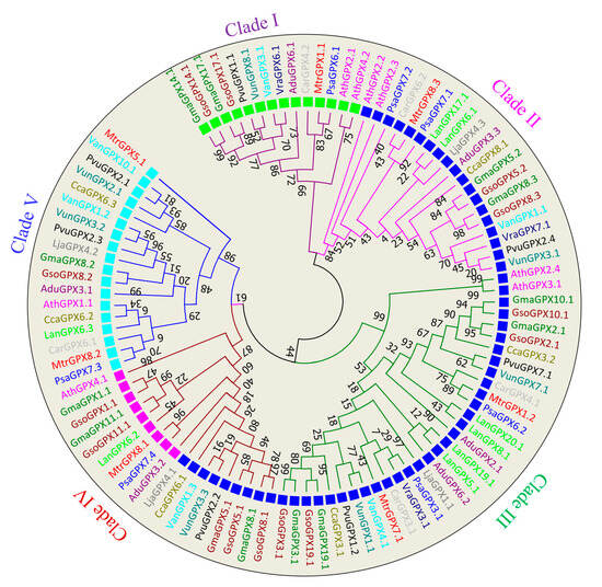 Phylogenetic analysis of GPXs members distributed them into five major clades, and each clade was represented with a different color of branch lines in Figure 2. Clade I consist of 14 members localized in the chloroplast; Clade II includes 19 members located in cytoplasm; Clade III is marked by thirty-one members with cytoplasmic localization, while Clade IV enclosed 18 members localized in both mitochondria and cytoplasm, such as mitochondrial (pink) and cytoplasm (blue). Clade V included 18 members with peroxisome localization. The clustering of the GPXs protein with different subcellular localization in the same group (clade II) depicts the gene duplication events leads to the formation of several GPX sequences. Tight clustering has been observed between G. max and G. soja genes compared other species, showing more similarity of G. max GPX genes with the G. soja genes compared to that of other legumes.