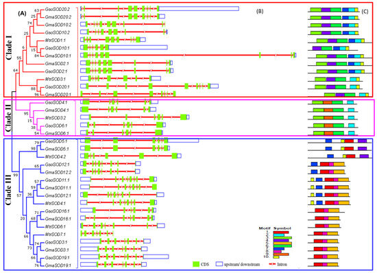 Phylogenetic relationship, exon–intron distribution/gene structure and conserved motifs in the SOD gene family in G. max, G. soja and M. truncatula. (A) The phylogenetic tree of the SOD gene family classified in to three clade: Clade I = Fe-SODs, Clade II = Mn-SODs, Clade III = Cu-SODs. (B) The untranslated region (UTRs), intron and exon distribution represented with the unfilled blue box, red shrinked line and green boxes, respectively. (C) Identification of the conserved motifs in SOD genes. Each motif is presented with a particular color.