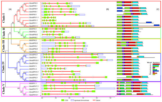 Phylogenetic relationship, exon–intron distribution/gene structure and conserved motifs in the GPX gene family in G. max, G. soja and M. truncatula. (A) The phylogenetic tree of GPX gene family classified into 5 clades represented with different colors of boxes on the phylogenetic tree (Clade I–V). (B) The untranslated region (UTRs), intron and exon distribution is represented with unfilled blue boxes, red shrinked lines and green boxes, respectively. (C) Identification of the conserved motifs in GPX genes. Each motif is presented with a particular color.