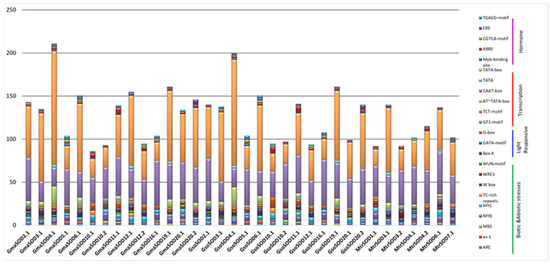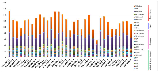 The SOD and GPX genes play a vital role in response to environmental stresses. We analyzed the promoter of G. max, G. soja and Medicago truncatula SODs and GPXs by using 2000 bp upstream sequences to explore their putative cis-acting regulatory elements which play a key role in stress and hormone signaling. The results depicted that 77 types of putative cis-elements were present in the promoter region of all SOD genes of targeted species and seven were unknown elements (Supplementary Table S3).