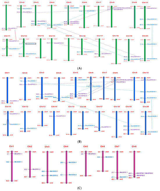 Chromosomal locations and gene duplication events of SOD and GPX genes of G. max (A), G. soja (B) and M. truncatula (C). The scale on the left side of chromosome is the position of the genes in megabases and on the right side of each chromosome gene names correspond to the approximate locations of each SOD and GPX gene. Furthermore, the segmentally duplicated genes are connected by dashed lines represented by the same color as SOD and GPX genes.