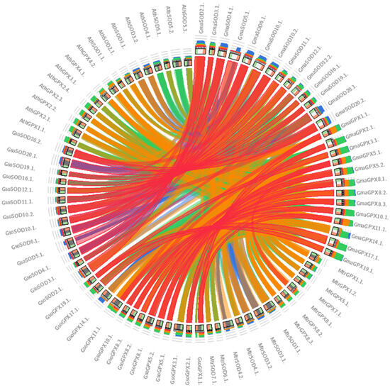 Comparative genomics assists in revealing the evolutionary relationship among the different species. Synteny was visualized among SOD and GPX genes of the four species viz., G. max, G. soja, Medicago truncatula and A. thaliana. The SODs and GPXs belonging to G. max and G. soja are mostly connected via red lines showing more than 90% identity. As G. soja is considered as the progenitor of the G. max, the same thing was supported by our results where some antioxidants gene sequences of G. max were 100% identical to G. soja genes, whereas the majority showed more than 90% similarity (Figure 8).
