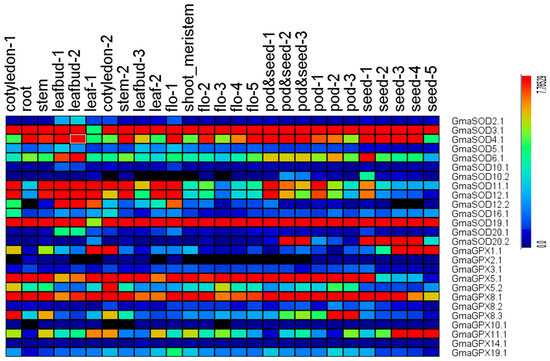 To study the expression of GmSOD and GmGPX genes in different tissues and organs, transcriptome data extracted from a public soybean database were used to investigate the differential expression of GmSOD and GmGPX genes [42]. RNA-seq data of soybean SOD and GPX genes in different tissues were shown in Supplementary Table S1. A heatmap showing tissue-specific expression profiles was generated using the log2-transformed (FPKM + 1) values of SOD and GPX genes. Finally, visualization of the expression levels of SOD and GPX genes was accomplished by using the MeV 4.9.0 program (Anghel Saligny Nr 2 400609, Cluj-Napoca, Romania)