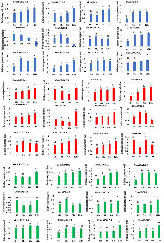 Expression of different selected SOD and GPX genes of G. soja under different stresses viz H2O2 (blue color), NaCl (red color) and PEG (green color). Data represent mean and standard deviation of three repeats (n = 3). Data with the same letters in lowercase (a, b, c and d) above bars indicate no significant differences at the 0.05 level at different time intervals in the soybean genotype according to the Duncan’s multiple range test.