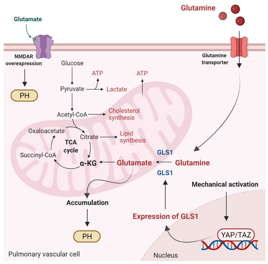 Glutaminolysis and glutamate accumulation contribute to pulmonary hypertension (PH). Glutaminolysis is a mitochondrial process responsible for obtaining cellular energy from the breakdown of glutamine. In this cellular pathway, glutamine is converted into glutamate, aspartate, CO2, pyruvate, lactate, alanine, and citrate. Initially, glutamine enters the pulmonary vascular cells via a glutamine transporter and is deaminated to glutamate by glutaminase (GLS1). Subsequently, glutamate is converted to α-ketoglutarate (α-KG) by glutamate dehydrogenase. α kg enters the tricarboxylic acid (TCA) cycle, where it is decarboxylated by α kg dehydrogenase to succinyl-CoA and CO2, providing energy for proliferating cells. Accumulation of glutamate in pulmonary vascular cells promotes PH. In addition, stiffening of the extracellular matrix in remodeled pulmonary cells activates the transcriptional coactivators Yes-associated protein 1 (YAP) and TAZ, leading to upregulation of GLS1 and enhanced glutaminolysis. Furthermore, in remodeled pulmonary arteries, the N-methyl-d-aspartate receptor (NMDAR) is overexpressed and overactivated.