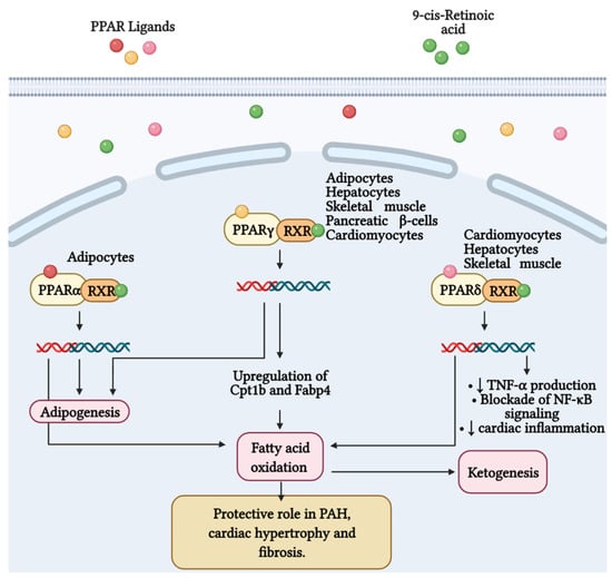 Fatty acid metabolism and its byproducts (ketones) play an important role in the development of right ventricular failure (RVF) and pulmonary arterial hypertension (PAH). Peroxisome proliferator-activated receptors (PPAR) belong to the superfamily of nuclear receptors that serve as ligand-activated transcription factors and consist of three members, PPARα, PPARγ, and PPARδ. These receptors together with retinoid X receptors (RXR) form heterodimers and bind to specific DNA sites to promote genetic transcription. PPARα is a master regulator of adipogenesis expressed mainly in adipose tissue and liver, as is PPARγ. Additionally, PPARγ regulates glucose and fatty acid metabolism in adipocytes, hepatocytes, skeletal muscle, and pancreatic β-cells. PPARγ agonists, such as pioglitazone, increase the expression of Cpt1b and Fabp4, proteins involved in fatty acid oxidation and transport in cardiomyocytes. These effects favor mitochondrial fatty acid oxidation and ATP production, leading to reversal of cardiac hypertrophy, fibrosis, and eliminating severe PAH. Furthermore, PPARδ stimulates fatty acid oxidation, decreases right ventricle hypertrophy and pulmonary congestion. In cardiac inflammation, PPARδ blocks nuclear factor κB (NF-κB) activation and inhibits tumor necrosis factor (TNF)-α synthesis.