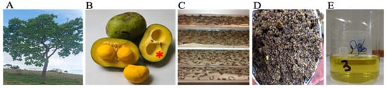 Pequi (Caryocar brasiliense, Camb.). The tree (left) is native to the Brazilian Cerrado (A), a savanna-like biome, with marked dry and wet seasons. The fruit (B) is edible and oily and has a thick, dense mesocarp and epicarp (asterisk) that form the bark, which is dried (C), macerated (D), and percolated in 95% ethanol to extract phenols. After percolation, the ethanol is removed by rotative evaporation (40 °C) and the final product (E) is obtained.