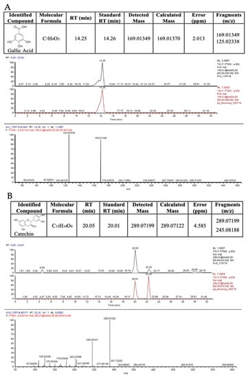 Qualitative high-efficiency liquid chromatography coupled to high-resolution mass spectrometry of the ethanolic extract of pequi bark. Representative chromatographic profiles of components detected in six of seven samples: (A) gallic acid; (B) catechin. RT—retention time.