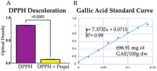 Our data demonstrated that the total phenol concentration in the pequi extract was 696.91 mg of GAE/100 g of dry weight (dw). To examine the free radical scavenging (neutralization) capacity of pequi extract, we performed the DPPH discoloration assay as described in the Materials and Methods. As a result, pequi extract demonstrated significant free radical scavenging potential, as shown by the 92.61 ± 0.23% rate of DPPH discoloration (Figure 3). In addition, radical neutralization of pequi extract potential reached 30.1 ± 1.27 μM of Trolox/g dw, further confirming the radical scavenging potential of the extract.