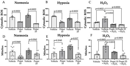 Cytosolic (A–C) and mitochondrial (D–F) Reactive Oxygen Species (ROS) production in human coronary artery endothelial cells (HCAEC) subjected to normoxia, hypoxia, and H2O2. HCAEC (1 × 104 cells/well) were pre-treated with 0 (vehicle control), 10, or 25 μg/mL of pequi extract for 24 h, followed by 48 h of normoxia (A,D), hypoxia (B,E), or six-hour exposure to 100 μM of H2O2 (C,F). Pequi extract decreased cytosolic ROS production in all treatments and concentrations as compared to controls (p < 0.05). The trend was similar for mitochondrial ROS, except for the pequi 10 μg/mL treatment in hypoxia conditions, where mitochondrial ROS were not significantly different from vehicle control without extract. Vehicle = Dimethyl sulfoxide (DMSO); Pequi 10 = 10 μg/mL; Pequi 25 = 25 μg/mL. Statistical analyses were performed using Mann–Whitney’s test. The results shown represent n = 6 (A–C) or n = 8 (D–F) independent experiments, using 5 replicates for each experiment/condition. MitoSox: Mitochondrial Superoxide Indicator.