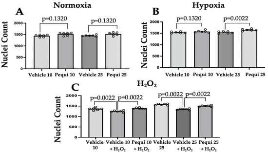 HCAEC were detached from plates by enzymatic dissociation using trypsin–ethylenediaminetetraacetic acid (EDTA) to form a cell suspension normalized to 6 × 104 cells/mL. Here, 10,000 HCAEC/well were plated to a 96-well plate and pre-incubated with extract with 10 μg/mL, 25 μg/mL, or without extract (vehicle control, DMSO) for 24 h; each group consisted of six wells. We induced OS in HCAEC by adding 100 μM of H2O2, except in controls, to five groups of six repetitions each for six hours. We subjected another group of cells to hypoxia in a chamber with 95% N2 and 5% CO2 for seven minutes, followed by 48 h inside a humidified incubator at 37 °C with 5% CO2, while maintaining control cells under normoxia. Nuclear-stained diamidino-2-phenylindole (DAPI) was applied to each well at 1 μg/mL and discarded after 15 min. Cells were observed on a fluorescence microscope and scanned images were analyzed using Image J software (version 1.53, NIH, Bethesda, MD, USA).