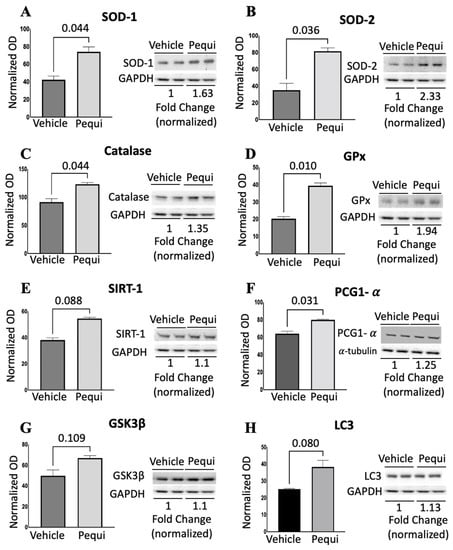 Pequi extract increases expression of antioxidant enzymes in HCAEC. Cells were cultured, pre-treated with pequi extract (25 μg/mL) for 24 h under normoxia conditions, and total protein content was extracted for Western blots analysis for Superoxide dismutase (SOD)-1 (A), SOD-2 (B), catalase (C), glutathione peroxidase—GPx (D), sirtuin 1—SIRT-1 (E), peroxisome-proliferator-activated receptor gamma coactivator 1-alpha (PCG1-α) (F), glycogen synthase kinase 3 beta (GSK3β) (G), and microtubule-associated protein 1A/1B-light chain 3 (LC3) (H). Western blots were normalized using α-tubulin or glyceraldehyde 3-phosphate dehydrogenase (GAPDH) as loading control. Five independent Western blot experiments were carried for each condition. Representative images are shown here. Statistical analysis was performed using Student’s t-test (p < 0.05). OD: Optical Density.