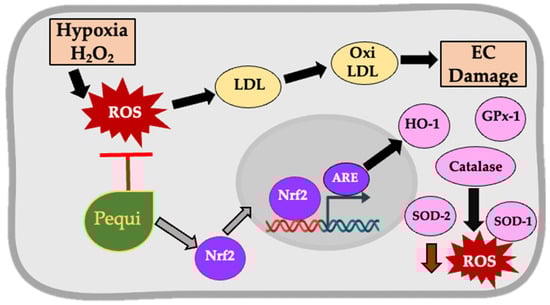 Proposed mechanisms of reduction in ROS in human coronary endothelial cells (HCAEC) by pequi extract. Hypoxia and H2O2 increase cytosolic and mitochondrial ROS in HCAEC. Polyphenol-rich pequi extract induces expression of antioxidant enzymes as a first line of defense against ROS, possibly by activating the Nrf2/ARE pathway and may reduce ROS and induce HCAEC proliferation. LDL: Low-density Lipoprotein; EC: Endothelial Cells; ARE: Antioxidant Responsive Element; Nrf-2: Nuclear factor-erythroid factor 2-related factor 2; HO-1: Heme Oxygenase-1; SOD-1: superoxide dismutase-1; SOD-2: superoxide dismutase-2; ROS: Reactive Oxygen Species.