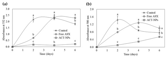 The results of lipid peroxidation analysis using FTC and TBA methods are shown in Figure 3a,b. The absorbance of the control started to increase rapidly within 2 days. However, it gradually decreased when it reached the maximum level. The absorption values of the FA constantly increased and reached a maximum level within 4 days, but slightly decreased over time. However, the absorption values of ACT-NPs increased slightly over 6 days and showed significantly lower levels than others within the experimental period (p < 0.05). TBA methods showed similar results. While the absorbances of control and FA increased rapidly, reaching the maximum level at 2 and 4 days, respectively, and decreased gradually over time. On the other hand, the absorbance of the ACT-NPs maintained significantly lower levels without gradual increase during the experimental period (p < 0.05).