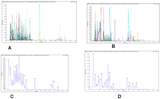 Figure 1. (A,C) Multiple reaction monitoring (MRM) and total ions current (TIC) and metabolite detection of negative ion mode; (B,D) MRM and TIC metabolite detection of positive ion mode multipeak mass spectral chromatogram of metabolites of fresh amla fruit.