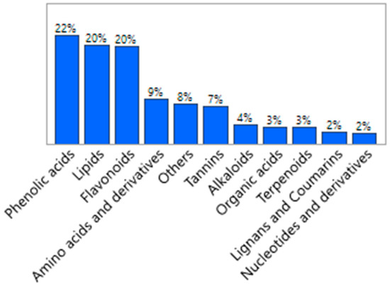 There were five main metabolic products: phenolic acids (22%), flavonoids (20%), lipids (20%), amino acids and derivatives (9%), and tannins (7%) (Figure 2). This study provides essential basic information on metabolites of amla fruit for further research.