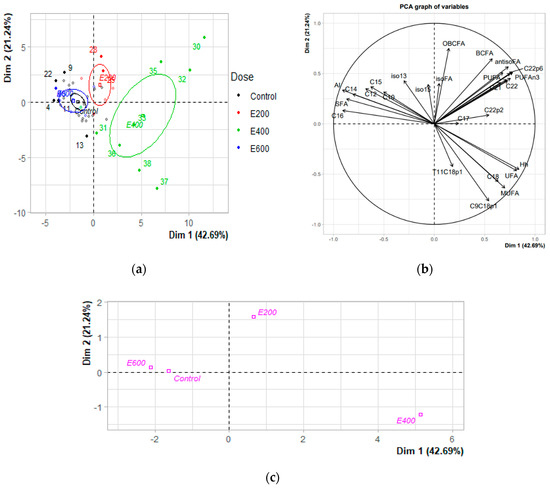 Figure 3. (a) Individuals factor map (PCA); (b) variable’s factor map (PCA); (c) qualitative factor map (PCA). The labeled factors are those the best shown on the plane, in which: control (0 g/d FAF); E200 (200 g/d FAF as fed); E400 (400 g/d FAF as fed); and E600 (600 g/d FAF as fed).