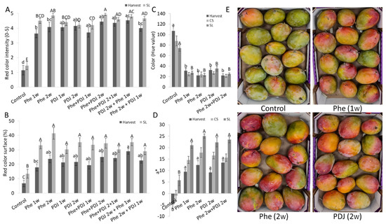 Red color evaluation of ‘Kent’ mango fruit peel. ‘Kent’ mango orchards were sprayed with 0.12% phenylalanine (Phe) or 0.2% prohydrojasmon (PDJ), one or two weeks preharvest. The fruit was evaluated at harvest (T0), after cold storage (CS, 3 weeks at 12 °C), and after shelf life (SL, 7 days at 22 °C). (A) Red color intensity (index 0–5). (B) Red surface area (% of fruit coverage). (C) Color (Hue value of the reddest point). (D) Green-red color range (a* value). (E) Representative pictures of ‘Kent’ mango boxes after shelf-life storage. Mean values and standard errors are presented. Statistical analysis was conducted for each time point separately (small or capital letters). Different letters represent a significant difference (p ≤ 0.05).