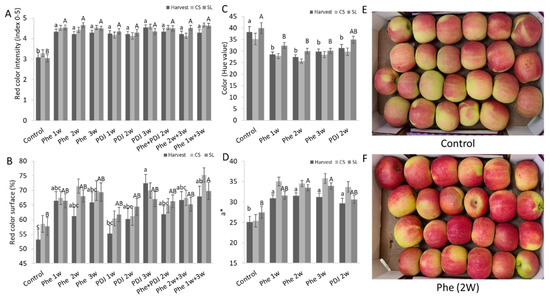 Red color evaluation of apple (cv. Cripps pink) peel. Apple orchard was sprayed preharvest with 0.12% phenylalanine (Phe) and/or 0.2% prohydrojasmon (PDJ). The fruit was evaluated at 3-time points: at harvest, after cold storage (CS, 3 weeks at 2 °C), and after shelf life (SL, 7 days at 20 °C). (A) Red color intensity (index 0–5). (B) Red surface area (% of fruit coverage). (C) Color (hue value at the reddest point). (D) Green-red color range (a* value at the reddest point). (E,F). Representative pictures of Cripps pink apple box after shelf-life storage. Mean values and standard errors are presented. Statistical analysis was conducted for each time point separately (small or capital letters). Different letters represent a significant difference (p ≤ 0.05).