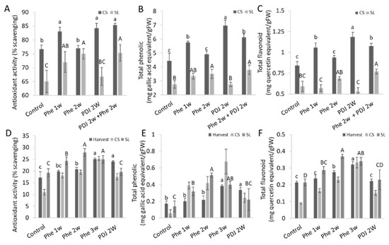 Effect of preharvest treatment with 0.12% Phe or 0.2% PDJ on antioxidant, phenolic, and flavonoid content in mango (cv. Kent) and apple fruit (cv. Cripps pink) at harvest, after cold storage (CS), and shelf-life (SL). Antioxidant activity, total phenolic, and total flavonoid content were evaluated from mango peels (cv. Kent) (A–C), apple (cv. Cripps pink) (D–F) peels. Mean values and standard errors are presented. Statistical analysis was conducted for each time point separately (small or capital letters). Different letters represent significant differences (p ≤ 0.05).