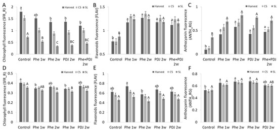 Effect of preharvest treatment of Phe and PDJ on chlorophyll, anthocyanin, and flavonoids fluorescence. Mango (cv. Kent, A–C) and apple (cv. Cripps pink, D–F) orchards were treated 1–3 weeks (1W, 2W, 3W) preharvest with 0.12% Phe or 0.2% PDJ and chlorophyll, anthocyanin, and flavonoids fluorescence at the reddest point of the fruit peel was analyzed at 3-time points: after harvest, after cold storage (CS), and after shelf-life (SL). (A,D) Chlorophyll fluorescence (SFR_R). (B,E) Flavonoids fluorescence (FLAV). (C,F) Anthocyanin fluorescence (ANTH_RG). Mean values and standard errors are presented. Statistical analysis was conducted for each time point separately (small and capital letters). Different letters represent significant differences (p ≤ 0.05).