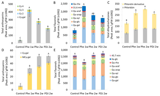 Quantification of metabolites using HPLC in mango and apple fruit peel. Mango (cv. Kent) and apple (cv. Cripps pink) were sprayed with 0.12% phenylalanine (Phe) or 0.2% prohydrojasmon (PDJ) one or two weeks preharvest. Apple (A–C) and mango (D,E) peels were analyzed after 3 weeks of cold storage at 2 °C and 12 °C, respectively. (A,D) Anthocyanin content in apple and mango, respectively. (B,E) Flavonol content in apple and mango, respectively. (C) Dihydrochalcones in apple. All the values expressed as Peak area/gFW (×106). Mean values and standard errors are presented. Different letters represent significant differences for total content (p < 0.05).
