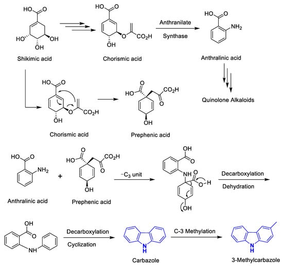 Biogenetically, the phyto-carbazole alkaloids are postulated to originate from the shikimate pathway (Figure 1) [,]. As shown in Figure 1, the diverse phyto-carbazole alkaloids identified from nature are classified based on their carbazole or 3-methylcarbazole core structure. Next, in vivo oxidation of the methyl group of the 3-methylcarbazole provides the formyl carbazole or methyl carbazole-3-carboxylate congener structures, which are commonly found in the genera Murraya, Clausena and Glycomis []. Moreover, the majority of the more than 330 identified phyto-carbazole alkaloid derivatives from nature are based on 3-methylcarbazole as their common precursor [].