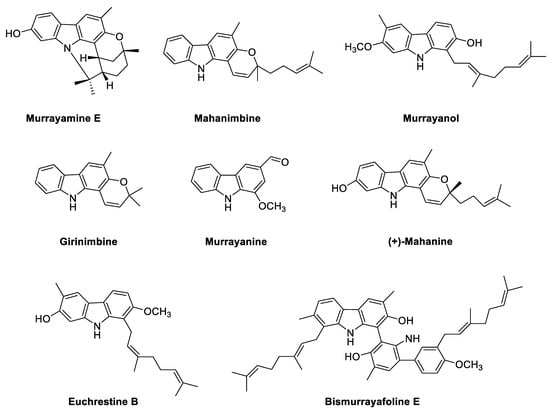 39. Ramsewak, R.S.; Nair, M.G.; Strasburg, G.M.; DeWitt, D.L.; Nitiss, J.L. Biologically active carbazole alkaloids from Murraya koenigii. J. Agric. Food Chem. 1999, 47, 444–447. [Google Scholar] [CrossRef]
