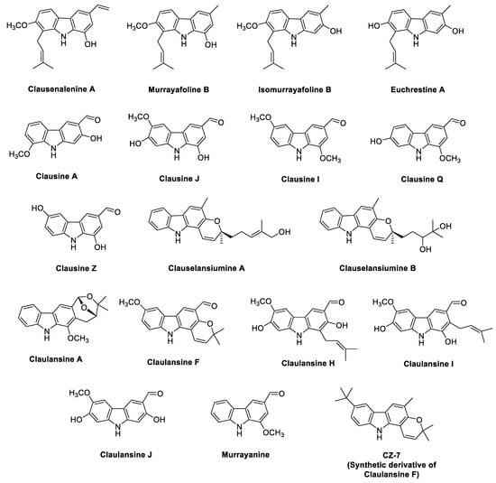 63. Potterat, O.; Puder, C.; Bolek, W.; Wagner, K.; Ke, C.; Ye, Y.; Gillardon, F. Clausine Z, a new carbazole alkaloid from Clausena excavata with inhibitory activity on CDK5. Pharmazie 2005, 60, 637–639. [Google Scholar] [CrossRef] [PubMed]