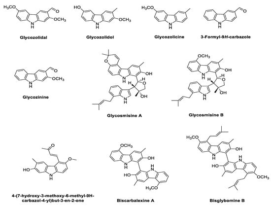 81. Bhattacharyya, P.; Chakrabartty, P.K.; Chowdhury, B.K. Glycozolidol, an antibacterial carbazole alkaloid from Glycosmis pentaphylla. Phytochemistry 1985, 24, 882–883. [Google Scholar] [CrossRef]