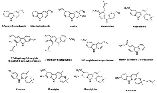 Micromelum is a rich source of bioactive secondary metabolites. Methylene chloride extract of the stem bark of M. hirsutum is rich in phyto-carbazole alkaloids, including 3-methylcarbazole, 3-formylcarbazole, lansine, micromeline, 3-formyl-6-methoxycarbazole and methyl carbazole-3-carboxylate, and some of these have displayed anti-tuberculosis activity []. Structures of the phyto-carbazole alkaloids isolated from the species of the genus Micromelum are presented in Figure 5.