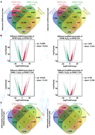 Global changes in mRNA and lncRNA transcripts in response to H2O2 stress in HPNE and PANC-1 cells. (A) Venn diagrams showing mRNA (left) and lncRNA (right) transcripts detected in control HPNE cells, H2O2-treated HPNE cells, control PANC-1 cells, and H2O2-treated PANC-1 cells. The overlapping regions show the co-expression of transcripts in the indicated samples. (B) Volcano plots showing the differentially expressed mRNA (left) and lncRNA (right) transcripts in the control and H2O2-treated HPNE cells (top) and PANC-1 cells (bottom). Red points: log2 (fold change) > 1 and padj < 0.05; green points: log2 (fold change) < −1 and padj < 0.05. (C) Venn diagrams showing the up- and downregulated differentially expressed mRNA (left) and lncRNA (right) transcripts with |log2 (fold change) > 1 and padj < 0.05 in both cell lines.