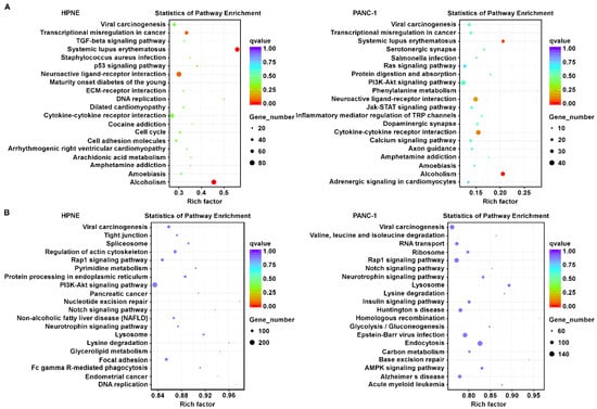 To investigate the alterations of signal transduction pathways induced by H2O2 in HPNE and PANC-1 cells, KEGG pathway enrichment analysis was utilized to reveal the altered pathways according to the changes in gene transcriptions. As shown in Figure 2A, the H2O2-induced changes in RNA transcripts commonly enriched in both cells cell lines were pathways involved in viral carcinogenesis, transcriptional misregulation in cancer, systemic lupus erythematosus, neuroactive ligand–receptor interaction, cytokine–cytokine receptor interaction, amphetamine addiction, amoebiasis, and alcoholism (Figure 2A). Since the functions of most lncRNAs still remain unclear, we searched their colocalized genes as possible cis-regulated targets. KEGG pathway enrichment analysis revealed that the H2O2-induced lncRNAs colocalized with genes that were enriched in pathways involved in viral carcinogenesis, Rap1 signaling, notch signaling, neurotrophin signaling, lysosome, and lysine degradation in both cell lines (Figure 2B). Compared with the differentially expressed genes (mRNAs), the differentially expressed lncRNAs seemed more enriched with potential cis-regulated genes involved in metabolism such as pyrimidine metabolism, protein processing in endoplasmic reticulum, lysine degradation, glycerolipid metabolism, valine, leucine, and isoleucine degradation, glycolysis/gluconeogenesis, and carbon metabolism (Figure 2). These data suggest a potential role of lncRNA in regulating cell metabolism upon ROS stress.