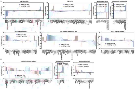 Distribution of differentially expressed genes in the H2O2-induced pathways identified by KEGG pathway enrichment analysis. (A) Expression of enriched genes in the indicated pathways associated with DNA replication, cell cycle, homologous recombination, base excision repair, p53 signaling, cell adhesion molecules (CAMs), and TGF-β signaling in HPNE cells. (B) Expression of enriched genes in Jak/STAT signaling pathway, phenylalanine metabolism, and salmonella infection, which changed significantly in PANC-1 cells.